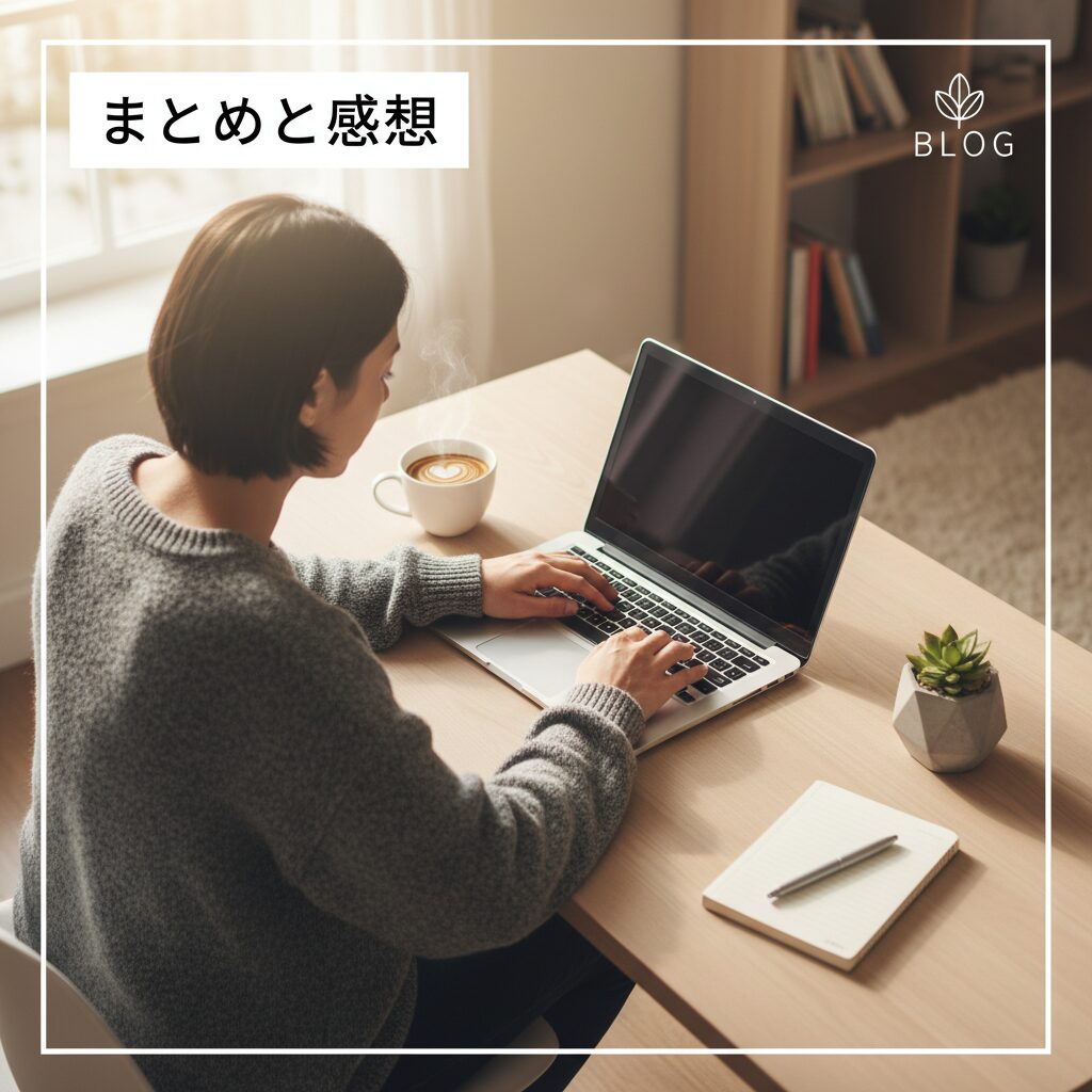 ※「まとめと感想という項目に画像を挿入したい。何かPCで作業をしているようなブログ用画像を生成して」プロンプトにて生成した画像です。