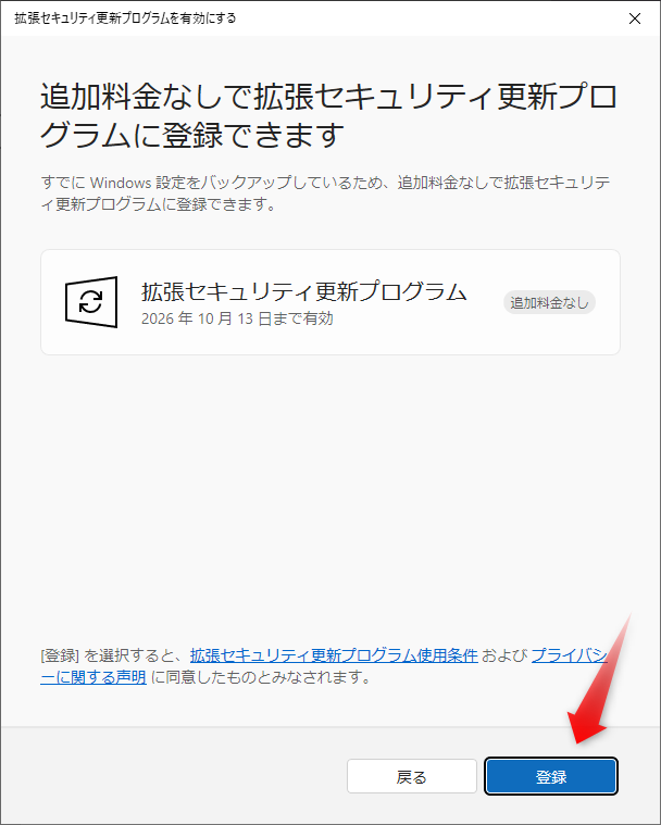 よくわからないまま、「今すぐ登録」から「2026年10月13日まで、延長セキュリティ更新プログラムに登録されています」画面までたどり着きました。