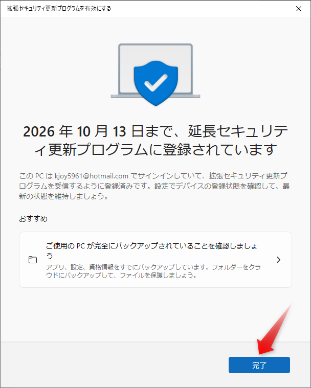 「2026年10月13日まで、延長セキュリティ更新プログラムに登録されています」という最後の画面は「完了」押した後は、再度表示させる方法もわかりません。