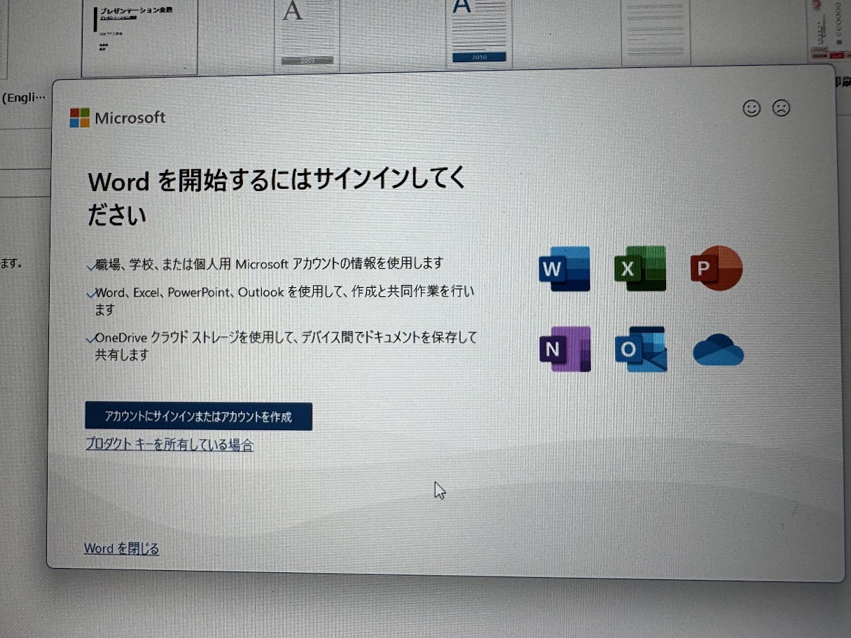 それが、今回は、初めてWordを起動すると、サインインを求められました。