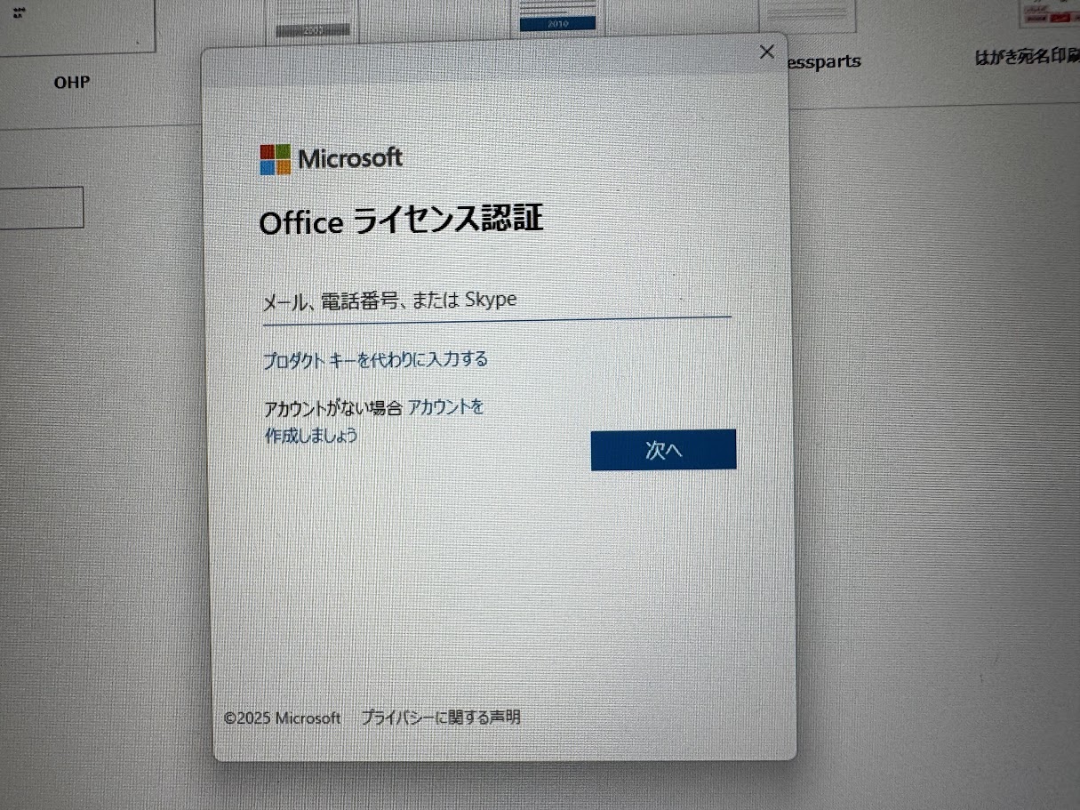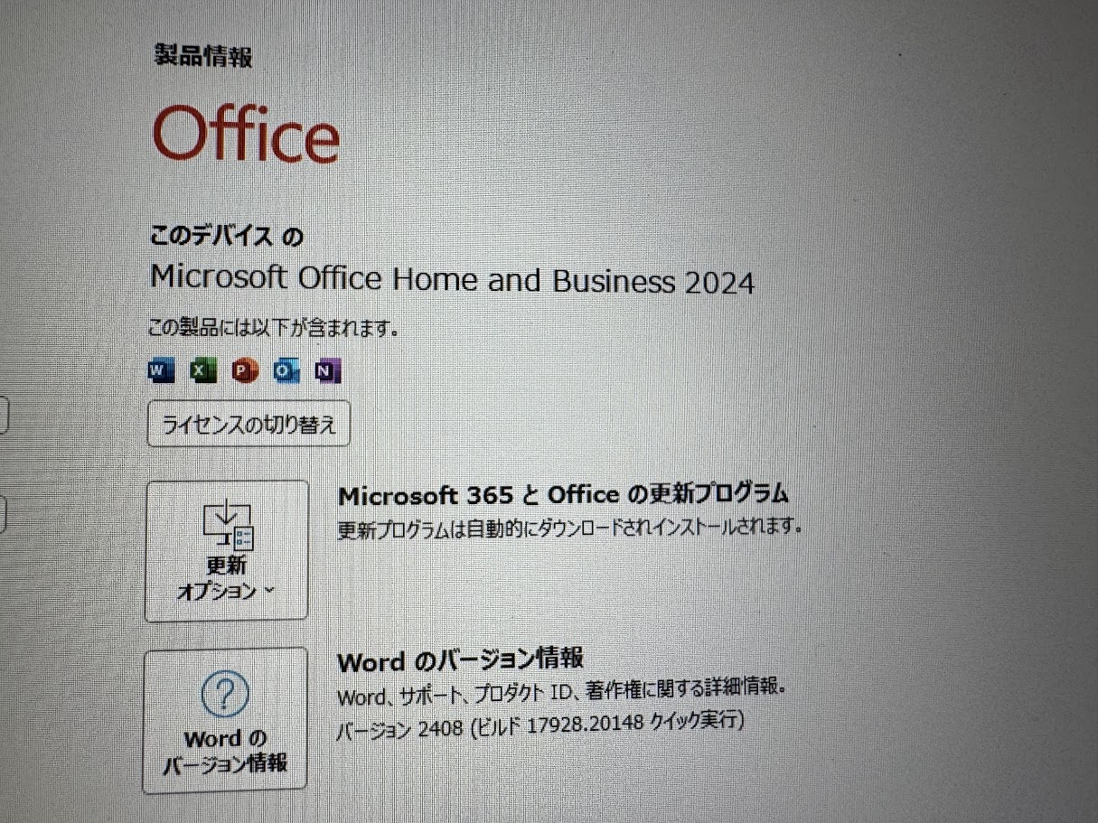 ついでに、Microsoft Office Home & Business 2024のライセンスキーを確認する方法も聞きましたが、PC本体紐付であり、ライセンスキーというのは確認できないそうです。
